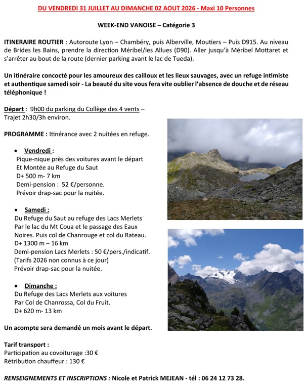 Fiche du week-end en Vanoise du 31 juillet au 2 août 2026 |